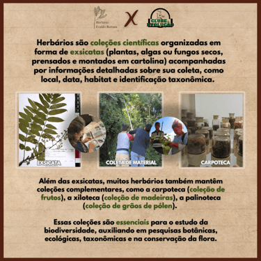 Herbários são coleções científicas organizadas em forma de exsicatas (plantas, algas ou fungos secos, prensados e montados em cartolina) acompanhadas por informações detalhadas sobre sua coleta, como local, data, habitat e identificação taxonômica. Além das exsicatas, muitos herbários também mantêm coleções complementares, como a carpoteca (coleção de frutos), a xiloteca (coleção de madeiras), a palinoteca (coleção de grãos de pólen). Essas coleções são essenciais para o estudo da biodiversidade, auxiliando em pesquisas botânicas, ecológicas, taxonômicas e na conservação da flora.