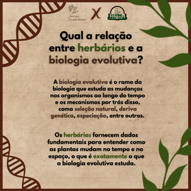 Qual a relação entre herbários e a biologia evolutiva? A biologia evolutiva é o ramo da biologia que estuda as mudanças nos organismos ao longo do tempo e os mecanismos por trás disso, como seleção natural, deriva genética, especiação, entre outros. Os herbários fornecem dados fundamentais para entender como as plantas mudam no tempo e no espaço, o que é exatamente o que a biologia evolutiva estuda.