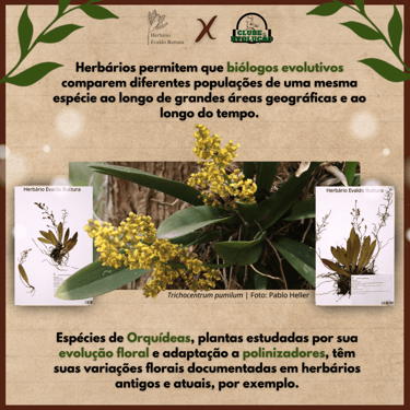 Herbários permitem que biólogos evolutivos comparem diferentes populações de uma mesma espécie ao longo de grandes áreas geográficas e ao longo do tempo. Espécies de orquídeas, plantas estudadas por sua evolução floral e adaptação a polinizadores, têm suas variações florais documentadas em herbários antigos e atuais, por exemplo.