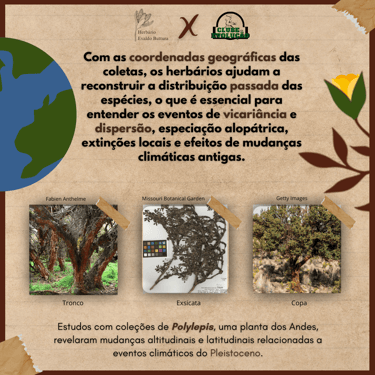 Com as coordenadas geográficas das coletas, os herbários ajudam a reconstruir a distribuição passada das espécies, o que é essencial para entender os eventos de vicariância e dispersão, especiação alopátrica, extinções locais e efeitos de mudanças climáticas antigas. Estudos com coleções de Polylepis, uma planta dos Andes, revelaram mudanças altitudinais e latitudinais relacionadas a eventos climáticos do Pleistoceno.
