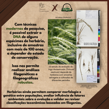 O estudo da evolução do trigo domesticado (Triticum aestivum), por exemplo, depende de herbários com amostras selvagens e cultivadas de diferentes períodos.