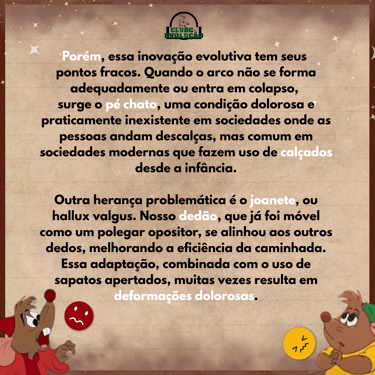 Porém, essa inovação evolutiva tem seus pontos fracos. Quando o arco não se forma adequadamente ou entra em colapso, surge o pé chato, uma condição dolorosa e praticamente inexistente em sociedades onde as pessoas andam descalças, mas comum em sociedades modernas que fazem uso de calçados desde a infância. Outra herança problemática é o joanete, ou hallux valgus. Nosso dedão, que já foi móvel como um polegar opositor, se alinhou aos outros dedos, melhorando a eficiência da caminhada. Essa adaptação, combinada com o uso de sapatos apertados, muitas vezes resulta em deformações dolorosas.