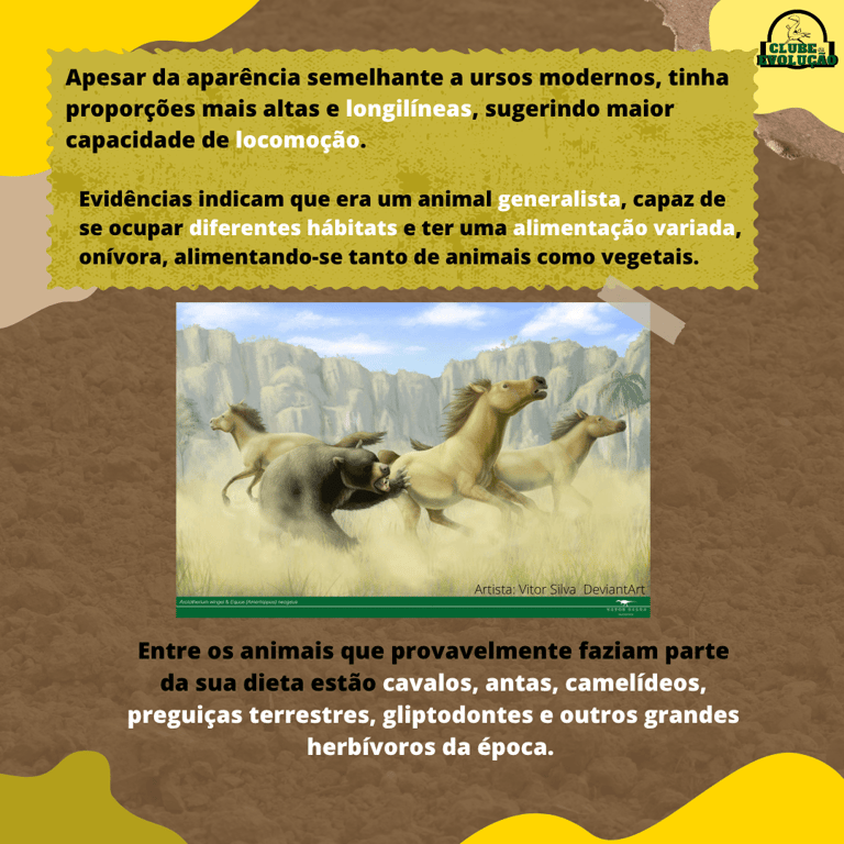Apesar da aparência semelhante a ursos modernos, tinha proporções mais altas e longilíneas, sugerindo maior capacidade de locomoção. Evidências indicam que era um animal generalista, capaz de se ocupar diferentes hábitats e ter uma alimentação variada, onívora, alimentando-se tanto de animais como vegetais. Entre os animais que provavelmente faziam parte da sua dieta estão cavalos, antas, camelídeos, preguiças terrestres, gliptodontes e outros grandes herbívoros da época.