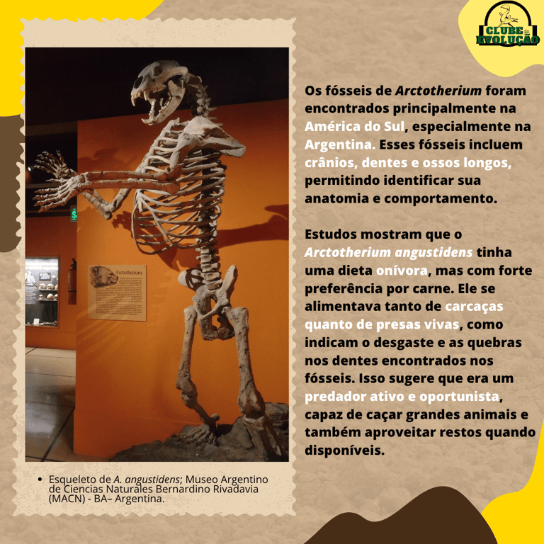 Os fósseis de Arctotherium foram encontrados principalmente na América do Sul, especialmente na Argentina. Esses fósseis incluem crânios, dentes e ossos longos, permitindo identificar sua anatomia e comportamento. Estudos mostram que o Arctotherium angustidens tinha uma dieta onívora, mas com forte preferência por carne. Ele se alimentava tanto de carcaças quanto de presas vivas, como indicam o desgaste e as quebras nos dentes encontrados nos fósseis. Isso sugere que era um predador ativo e oportunista, capaz de caçar grandes animais e também aproveitar restos quando disponíveis.
