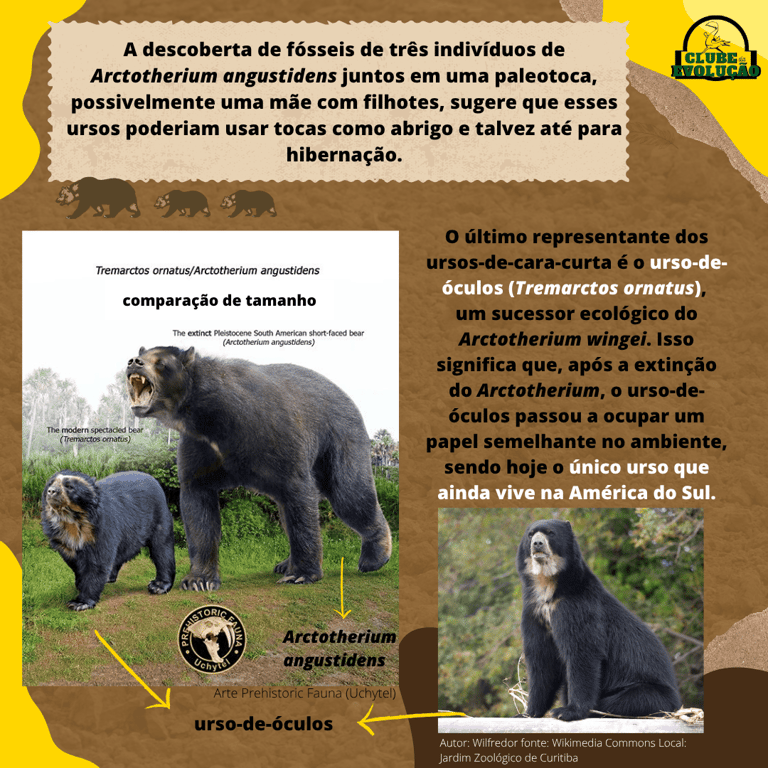 A descoberta de fósseis de três indivíduos de Arctotherium angustidens juntos em uma paleotoca, possivelmente uma mãe com filhotes, sugere que esses ursos poderiam usar tocas como abrigo e talvez até para hibernação. O último representante dos ursos-de-cara-curta é o urso-de-óculos (Tremarctos ornatus), um sucessor ecológico do Arctotherium wingei. Isso significa que, após a extinção do Arctotherium, o urso-de-óculos passou a ocupar um papel semelhante no ambiente, sendo hoje o único urso que ainda vive na América do Sul.