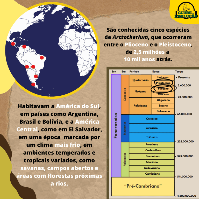 São conhecidas cinco espécies de Arctotherium, que ocorreram entre o Plioceno e o Pleistoceno, de 2,5 milhões a 10 mil anos atrás. Habitavam a América do Sul, em países como Argentina, Brasil e Bolívia, e a América Central, como em El Salvador, em uma época marcada por um clima mais frio, em ambientes temperados e tropicais variados, como savanas, campos abertos e áreas com florestas próximas a rios.