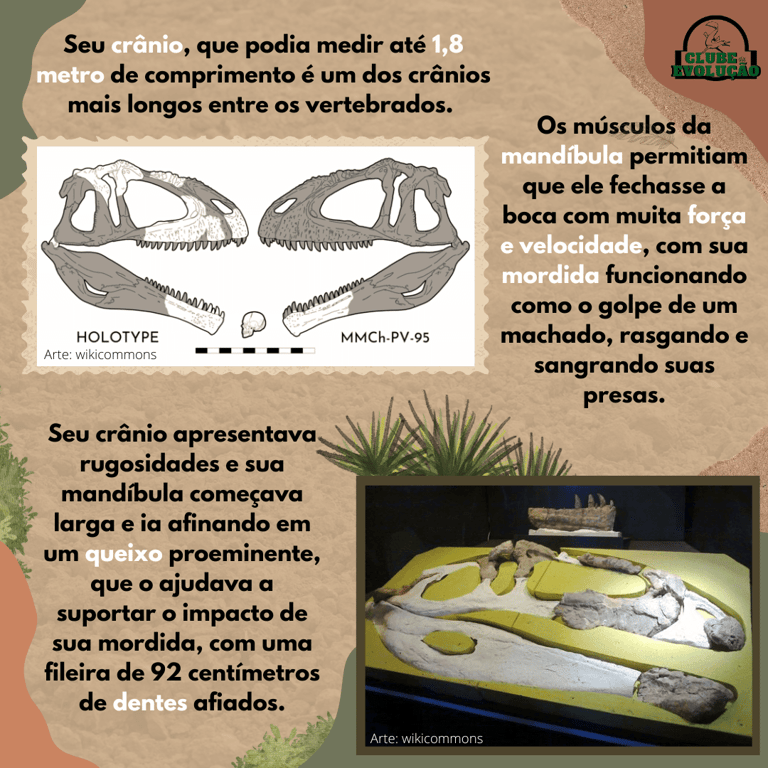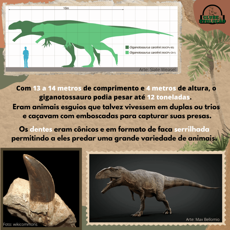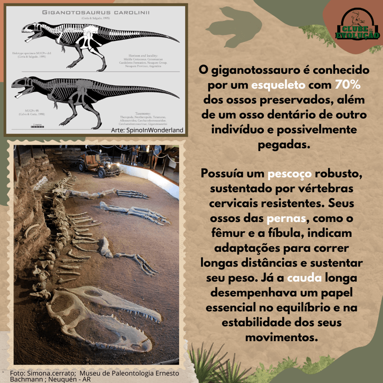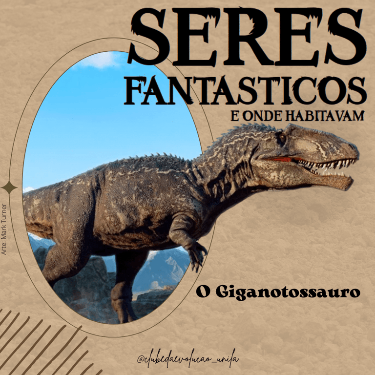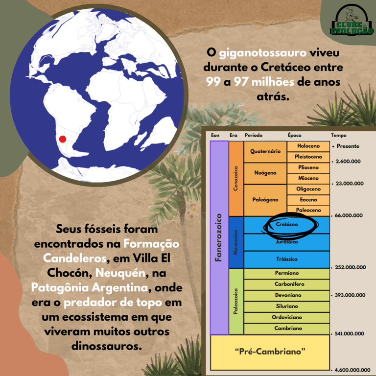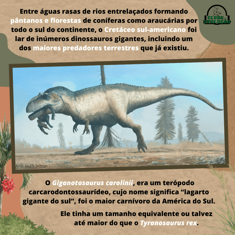 Entre águas rasas de rios entrelaçados formando pântanos e florestas de coníferas como araucárias por todo o sul do continente, o Cretáceo sul-americano foi lar de inúmeros dinossauros gigantes, incluindo um dos maiores predadores terrestres que já existiu. O Giganotosaurus carolinii, era um terópodo carcarodontossaurídeo, cujo nome significa “lagarto gigante do sul”, foi o maior carnívoro da América do Sul. Ele tinha um tamanho equivalente ou talvez até maior do que o Tyranosaurus rex.