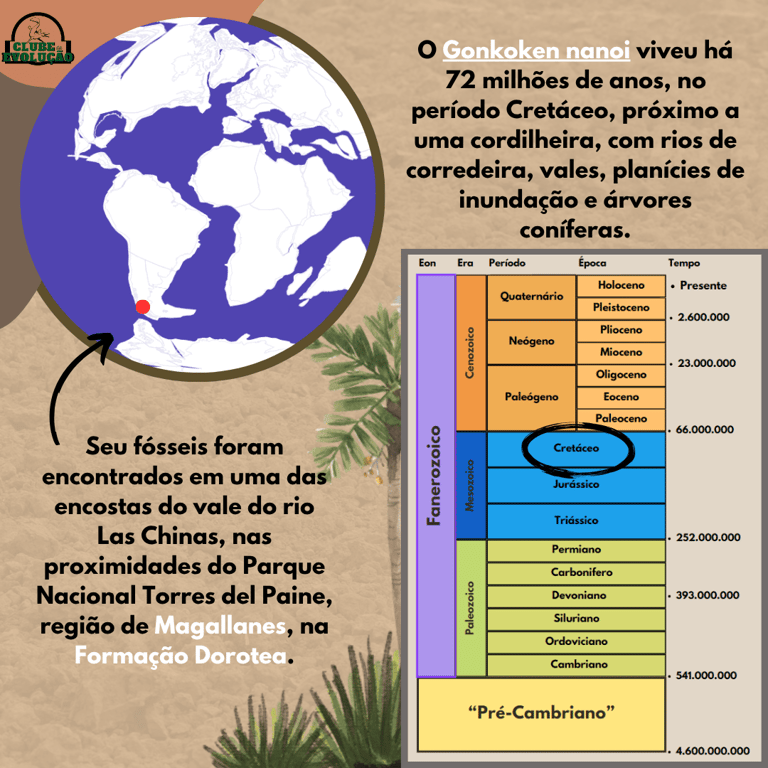 O Gonkoken nanoi viveu há 72 milhões de anos, no período Cretáceo, próximo a uma cordilheira, com rios de corredeira, vales, planícies de inundação e árvores coníferas. Seu fósseis foram encontrados em uma das encostas do vale do rio Las Chinas, nas proximidades do Parque Nacional Torres del Paine, região de Magallanes, na Formação Dorotea.